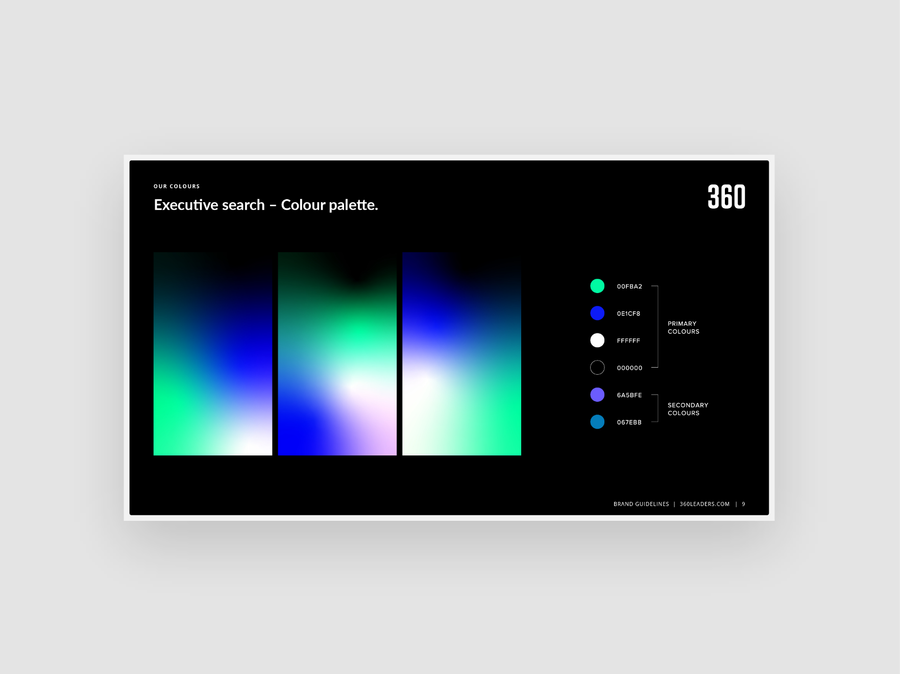 ‘Executive search’ focuses on finding the best candidates to support growth plans, here we used green and blue to represent new beginnings and responsibility. Finally, merging both services created this unique gradient that combines the core colours of each palette, creating a whole new visual aesthetic.