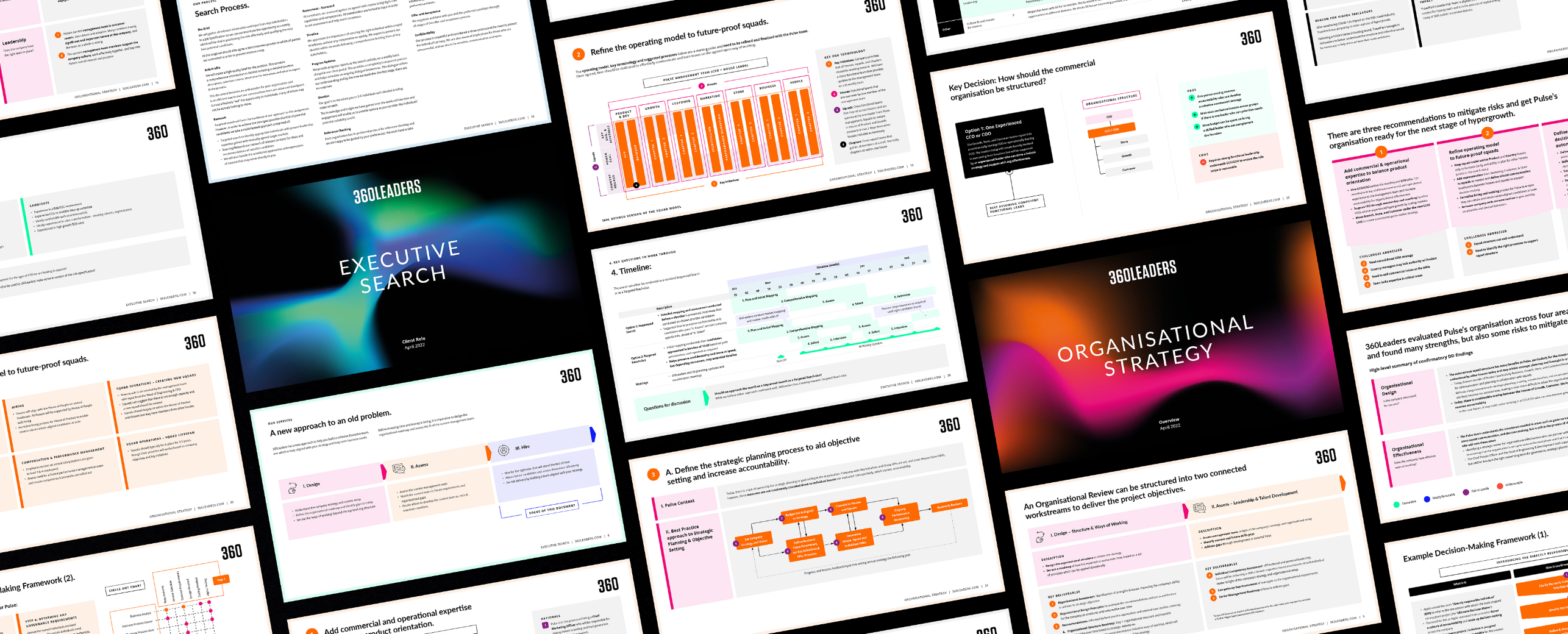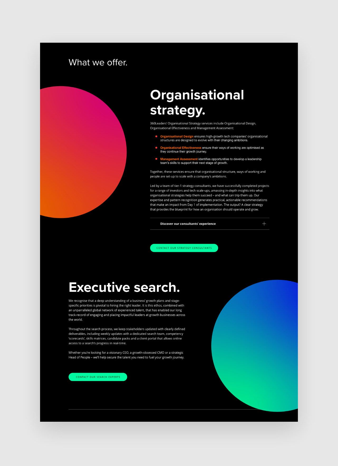 At 360Leaders they think differently and we wanted the 360-degree approach to reflect in their brand colours. We divided the colour palette up, with each service having its distinct colour palette. ‘Organisational strategy’ is a bespoke service ensuring structures, processes, and people are set-up to scale with their ambitions. We used warm colours to reflect optimism and good communication.