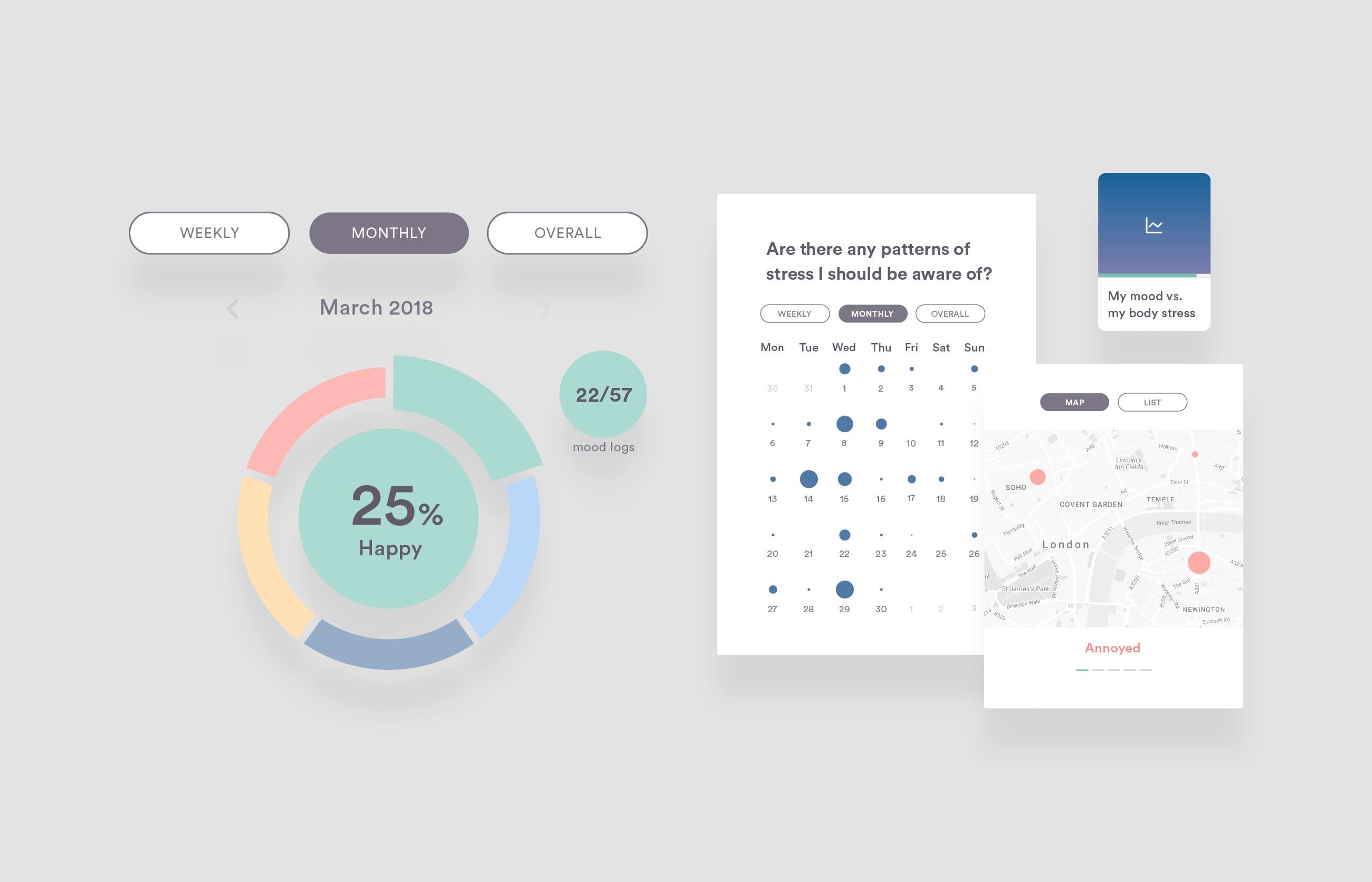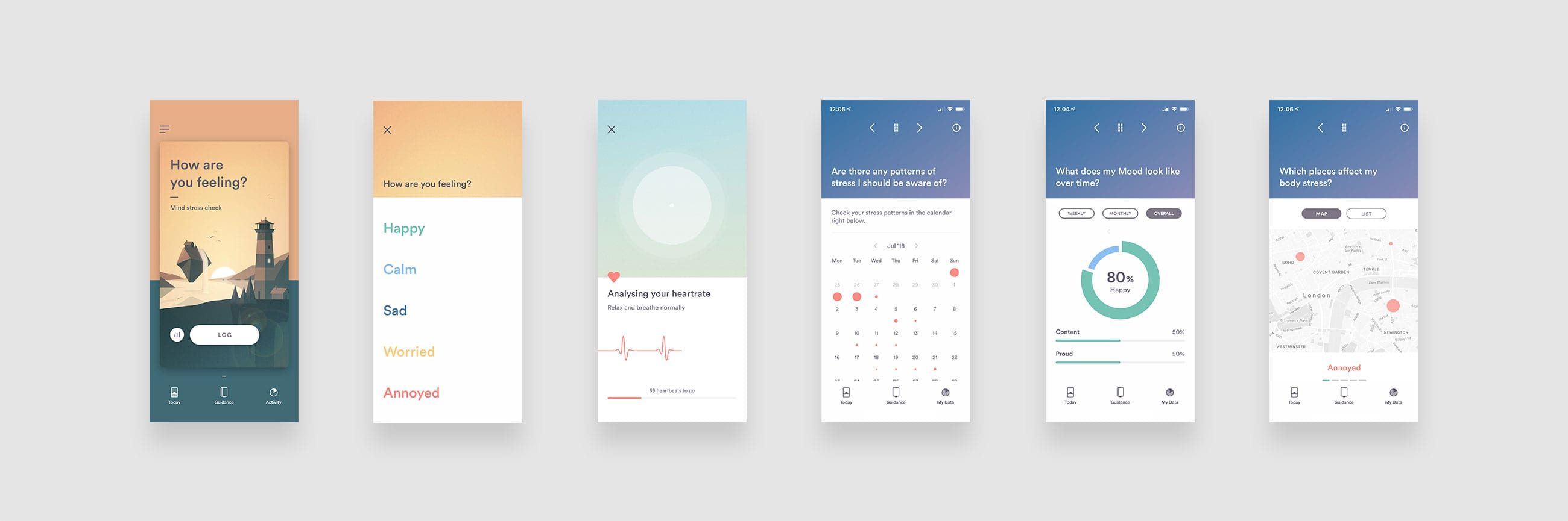 BioBeats first product, Hear and Now, looked at tools to help people to cope with and control their stress, initially all based around sound, heart monitoring and a deep breathing exercise. Our job was to help rename and reintroduce the product through a new brand identity and to rewrite the app’s UX.