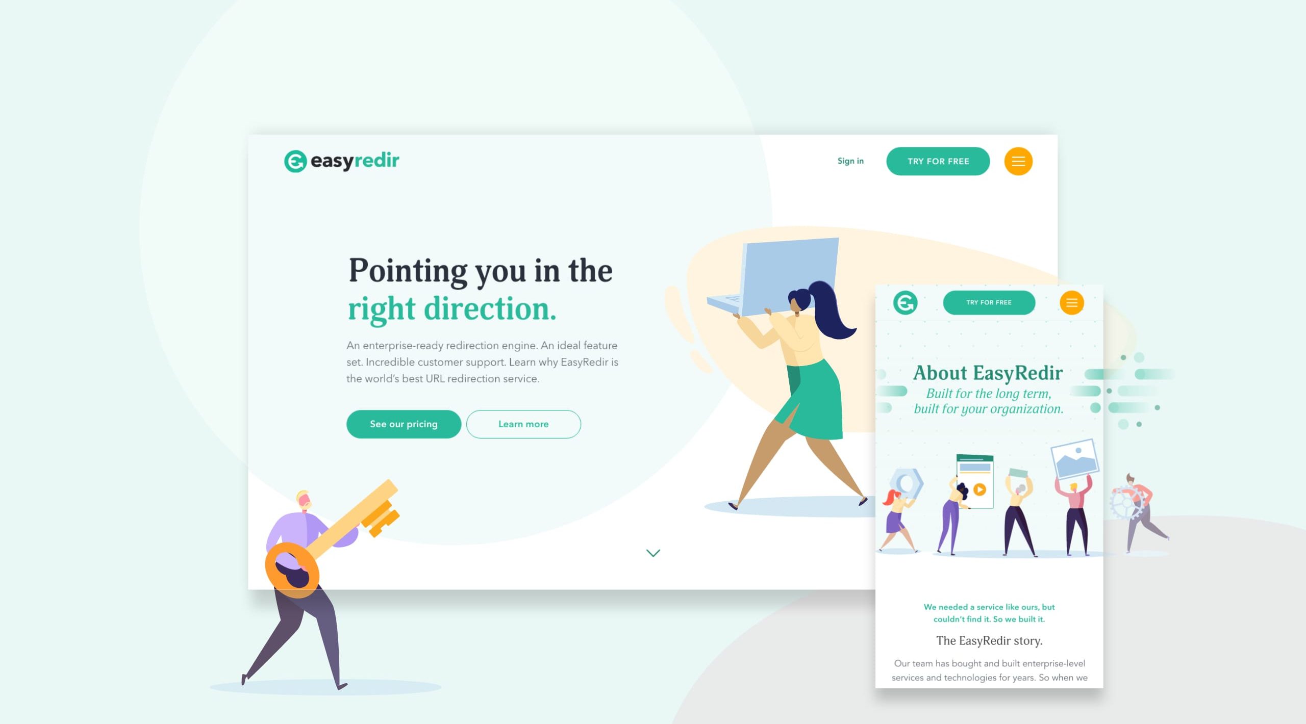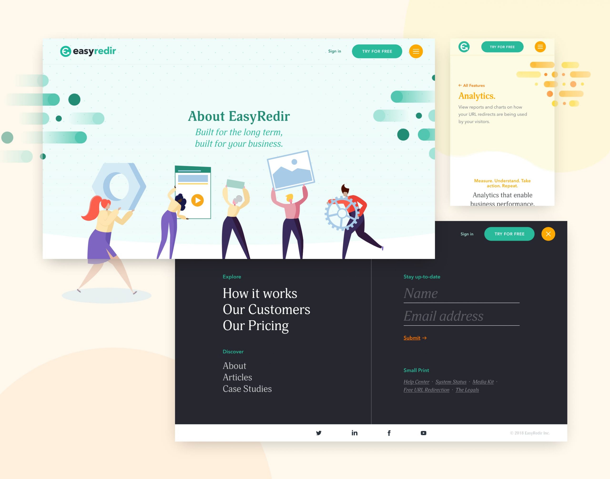 With the initial brand creation happening several years prior, our initial task was to refresh and expand the existing range of visual assets. Our goal was to move the brand forward and create room to evolve alongside their customers and services. We set about creating a rounded look-and-feel that elevated the EasyRedir brand from being a handful of team members, to a fast moving and established company, easily able to handle some of the largest businesses in the world.