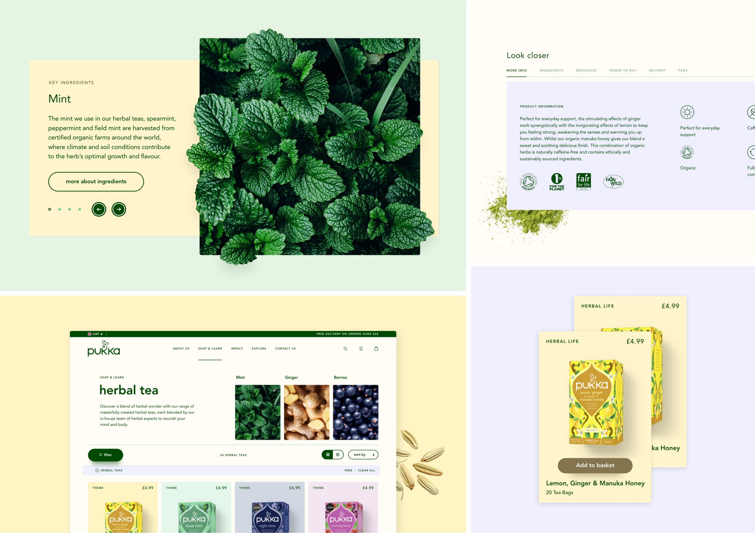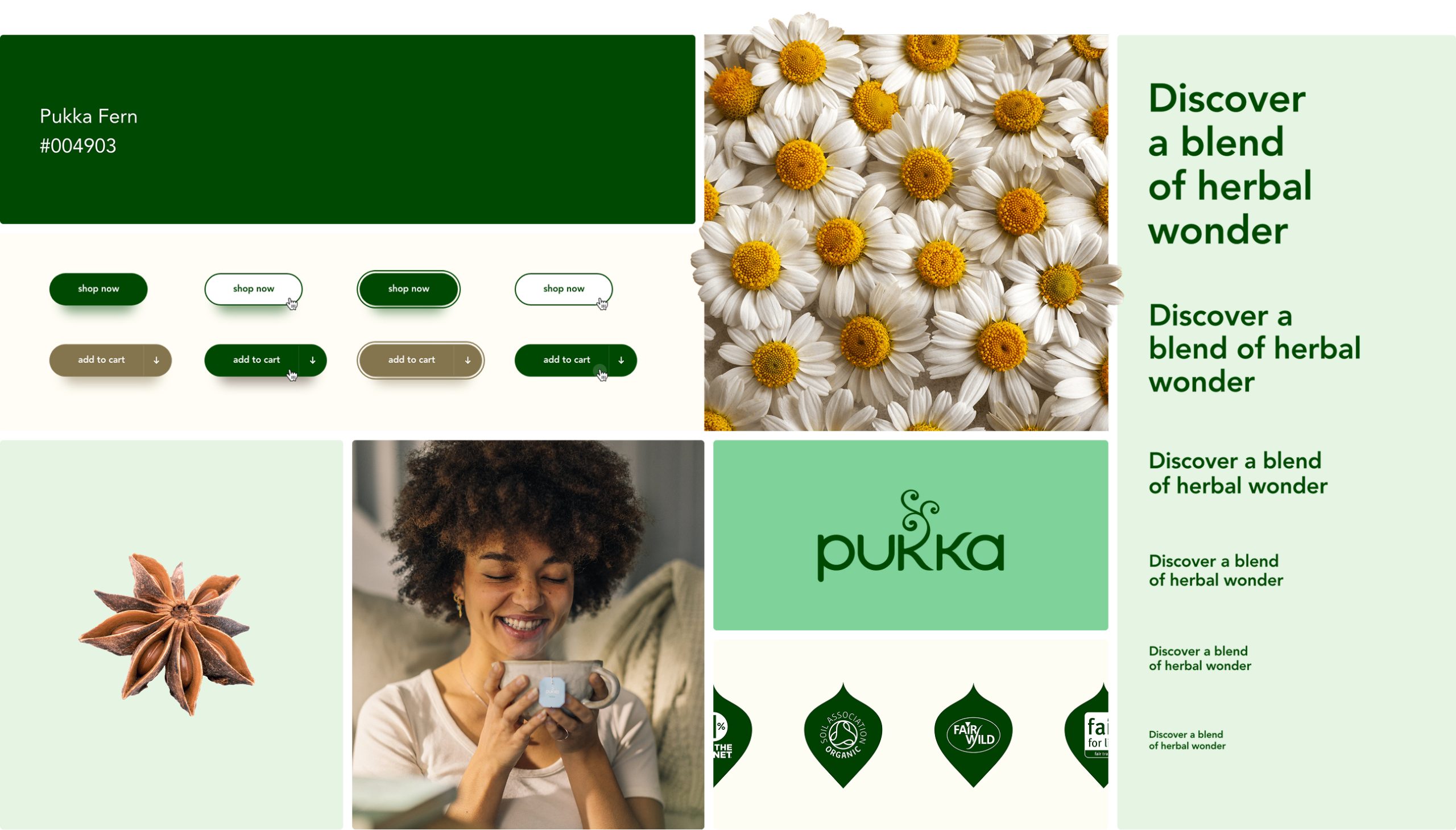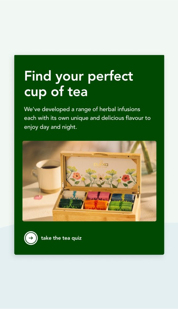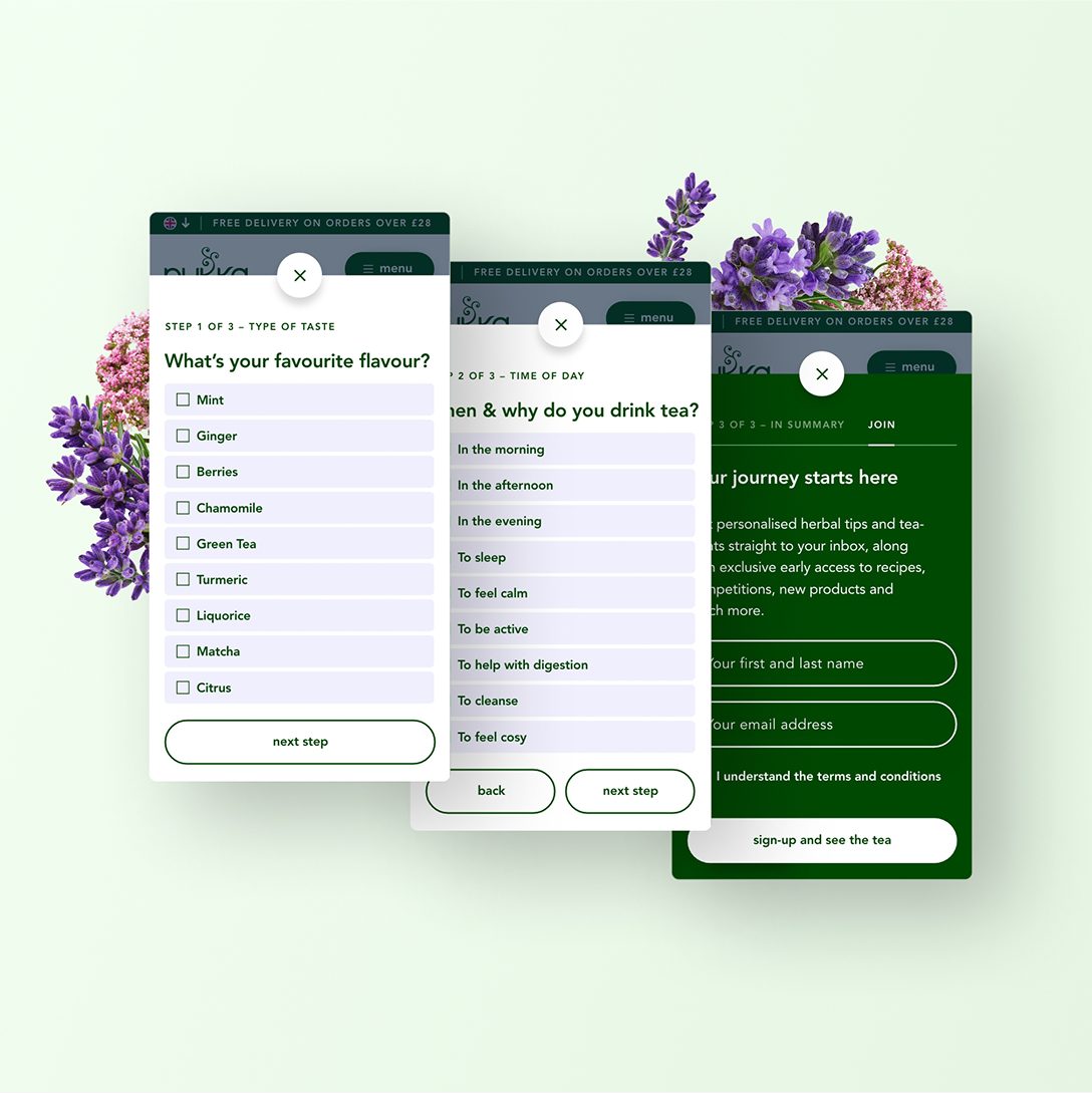 The idea of ‘discover blend of herbal wonder’ set the tone for every design and UX decision. We wanted visitors to feel the richness of the herbs and the craft of blending from the moment they landed on the website. Each tea was treated as a story in itself. We worked with Pukka to document every key ingredient from where it is grown and how it is harvested to what flavour and wellbeing benefits it brings. These profiles informed our direction for copy and image creation, giving each blend a vivid character.