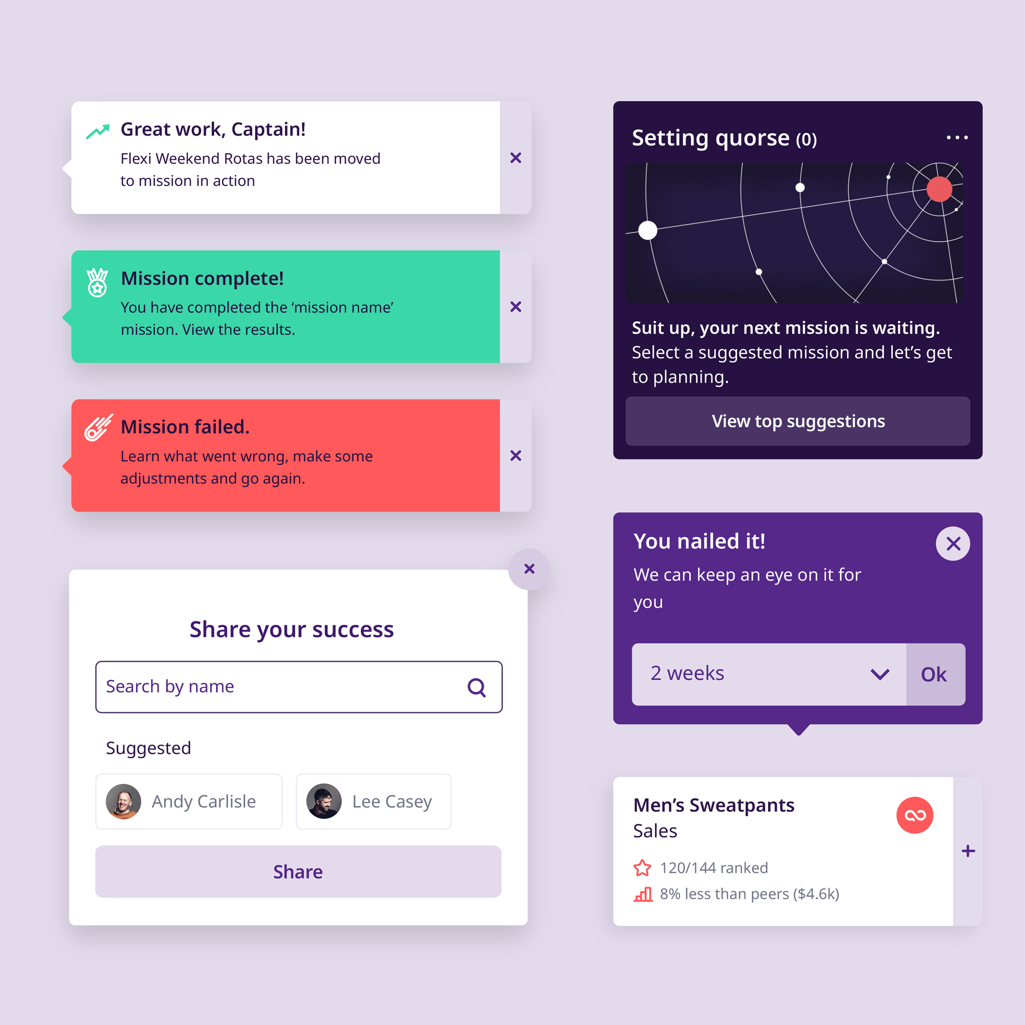 Our main focus and the core part of the app was around central tasks and a mission control centre. Organised through a mix of suggestive automation through Quorso’s clever AI as well as manual management task setting, the idea was to send managers on weekly Missions to drive improvement, communication and reporting. By supporting an agile approach to business we were able to support the app’s nimble functionality through simplicity of design and urgency of user requirement. Endless number-crunching and overwhelming effort becoming a thing of the past and store operations becoming agile, simple and human.